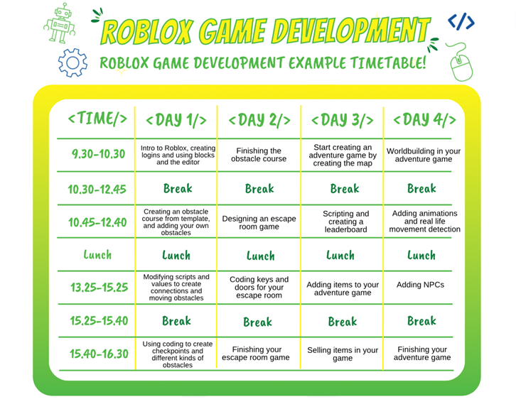 As part of the course, the children will learn the basics of how Roblox Game Development works, and design three games of their own.